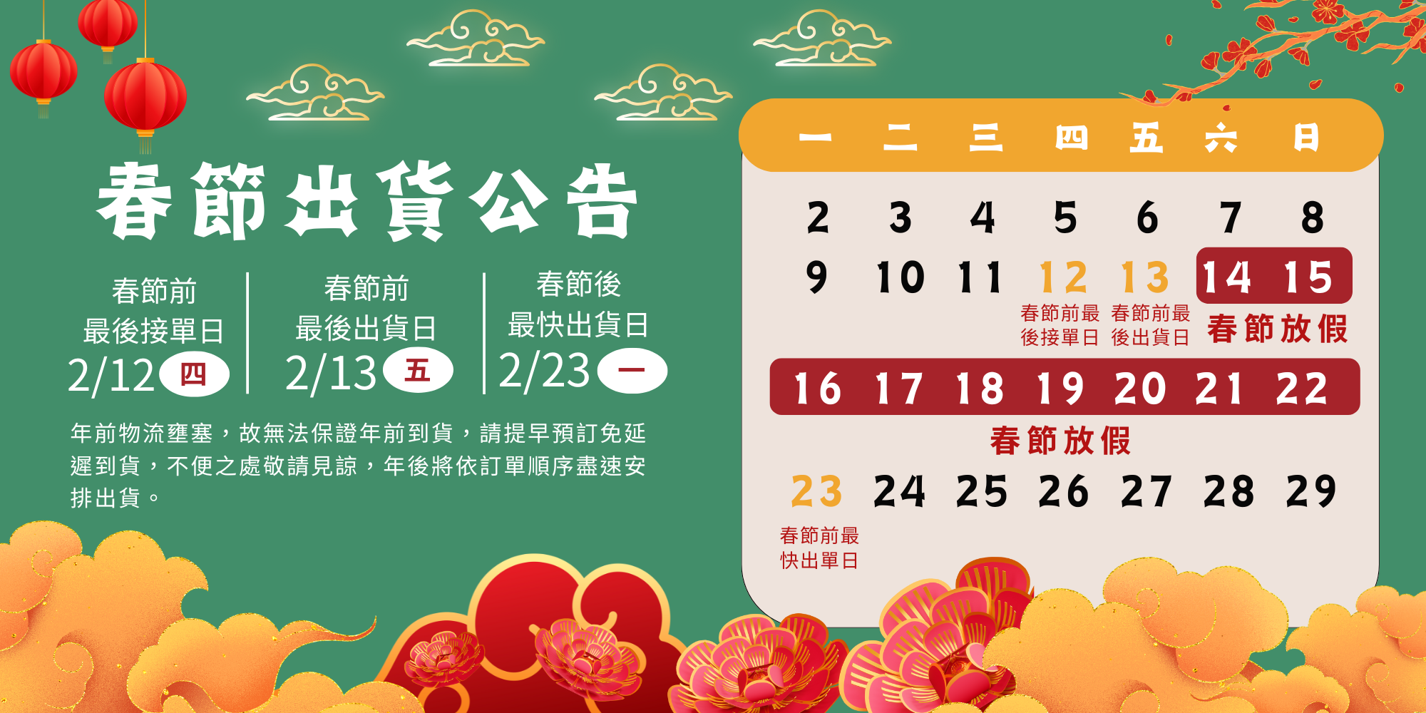 農曆馬年春節期間營業與出貨安排公告 親愛的顧客您好:感謝您在過去一年對院好 YuanHao 寵物骨灰罈專賣店的信任與支持。農曆春節將至,為協助您妥善安排訂購與取貨時程,特此公告春節期間之營業與出貨安排,敬請留意以下說明。一、春節期間營運與出貨時程春節前最後接單日:2025 年 2 月 12 日(星期四)當日完成下單並完成付款之訂單,可安排於春節前出貨(客製化產品除外)。春節前最後出貨日:2025 年 2 月 13 日(星期五)春節期間暫停出貨:2025 年 2 月 14 日(星期六)至 2025 年 2 月 22 日(星期日)春節後恢復出貨日:2025 年 2 月 23 日(星期一)起將依訂單完成時間順序陸續安排出貨。二、客製化訂單說明春節連假期間,客製化訂單之製作天數將較平日增加。所有客製訂單將依完成下單時間及客製資料提供完整之順序進行製作與排程,敬請提前規劃並預留作業時間,感謝您的理解與耐心等候。三、門市參觀與自取服務2025 年 2 月 14 日(星期六)至 2 月 22 日(星期日)期間,門市將暫停開放來店預約參觀、現場購物與自取服務,包含線上預約系統、電話及 LINE 預約。2025 年 2 月 23 日(星期一)起,門市恢復正常營業,開放參觀與選購。四、客服服務說明春節連假期間(2025 年 2 月 14 日至 2 月 22 日),LINE 官方客服將採不定時回覆。多數常見問題可先參考官方 LINE 自動回覆內容或商品頁面說明資訊。 如回覆稍有延遲,敬請見諒,我們將於節後第一時間盡快協助您。 再次感謝您對院好 YuanHao 的支持與信任。值此馬年新春之際,敬祝您馬到成功、步步高昇,新的一年平安順心、健康幸福,萬事如意。 院好 YuanHao 寵物骨灰罈專賣店 團隊 敬上