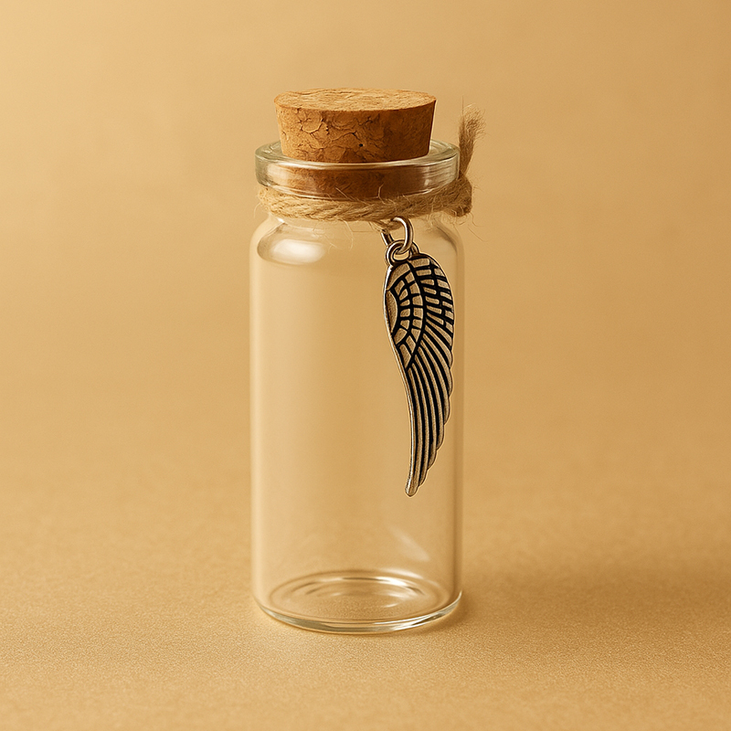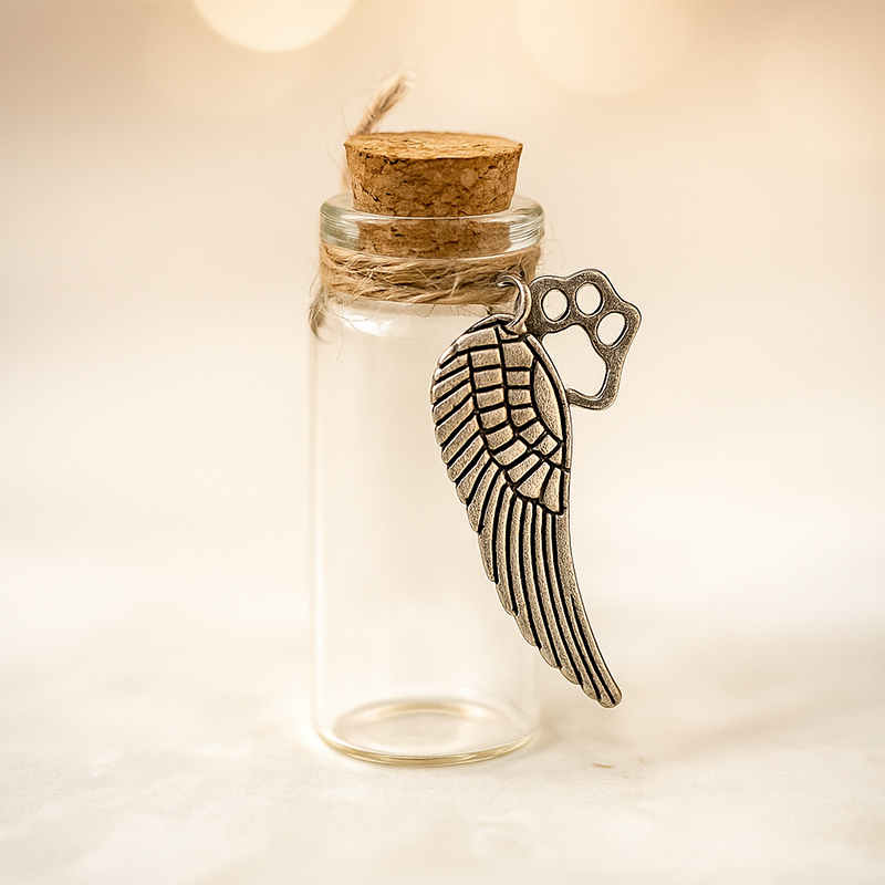由高品質玻璃製成的瓶身,精緻的軟木塞瓶蓋,不僅保護您心愛的寶貝毛髮,更將每一刻珍藏。瓶身旁的不鏽鋼銀飾,一邊是柔美的天使翅膀,一邊是寵愛的寵物腳丫,完美呈現出您與摯愛之間獨一無二的連結。