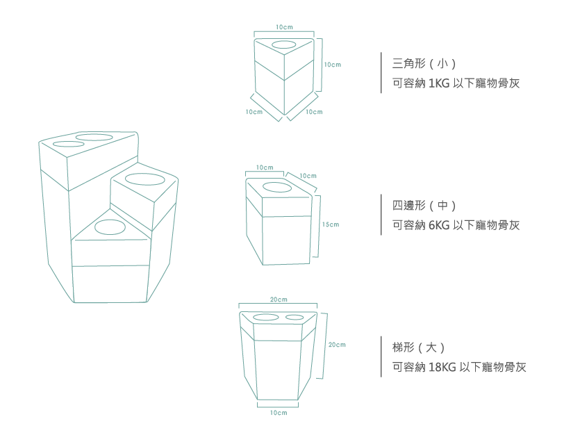 梯形 ( 大 ):可容納一只 18KG 或兩只 9KG 以下寵物骨灰