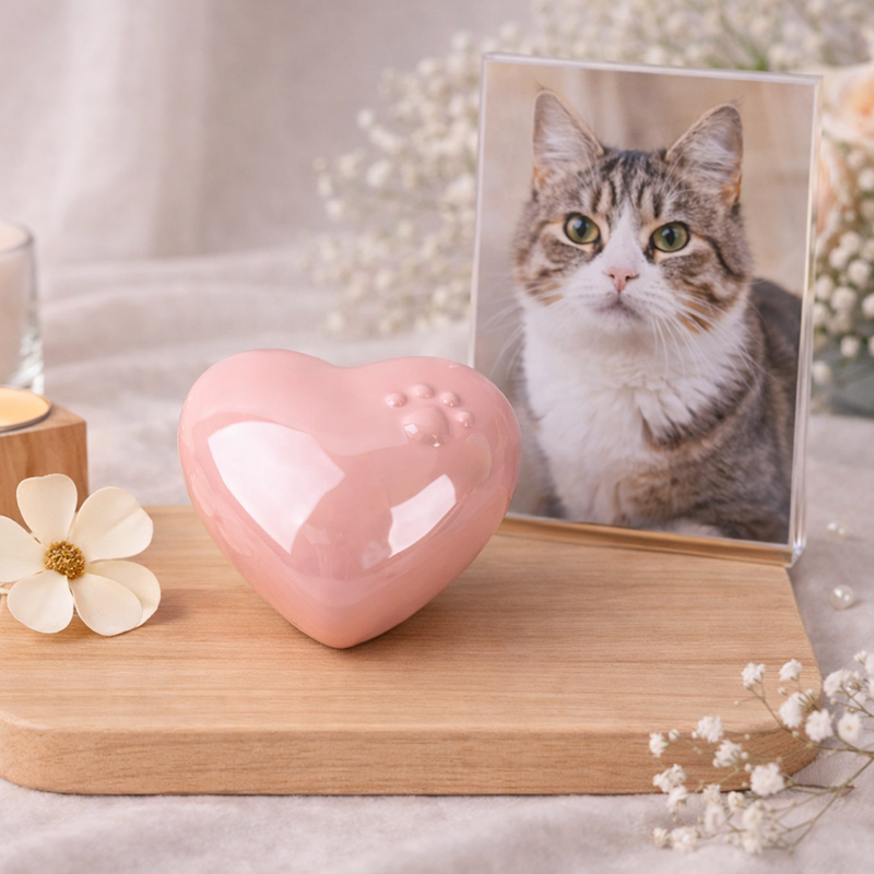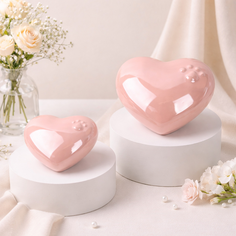 這款以溫柔愛心造型打造的寵物骨灰罈,細緻呈現柔霧粉與純淨白兩款色系,低調卻深情。